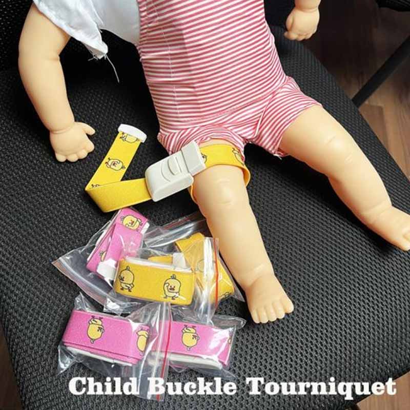 부드럽고 탄력 있는 소재로 제작된 소아용 버클 지혈대. 성인용 지혈대에 비해 소아용 버클 지혈대는 어린이의 팔이나 다리에 맞는 크기입니다. 아이들의 혈관과 피부에 무리한 압력을 가하지 않고 정밀한 출혈 조절이 가능합니다.